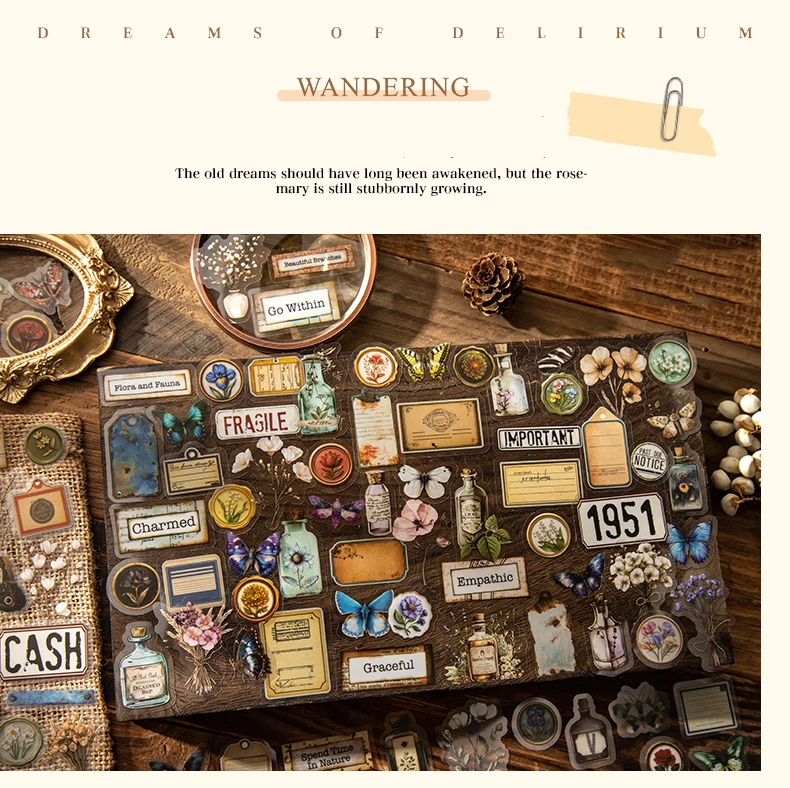 JIANWUDream of Delirium Series Vintage Flower Butterfly Label Landscape Material Collage PET Sticker Creative Journal Stationery